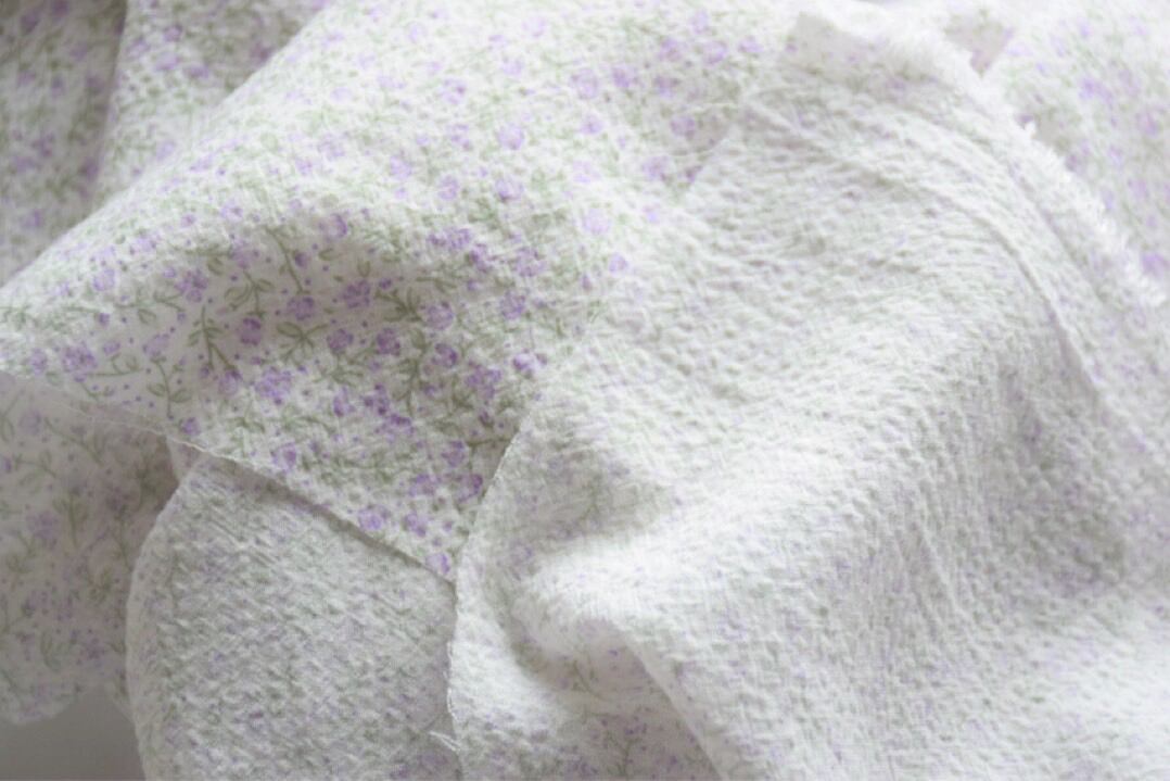 コットン×レーヨンのリップル生地に淡いカラーのフラワーが全面に散りばめられています